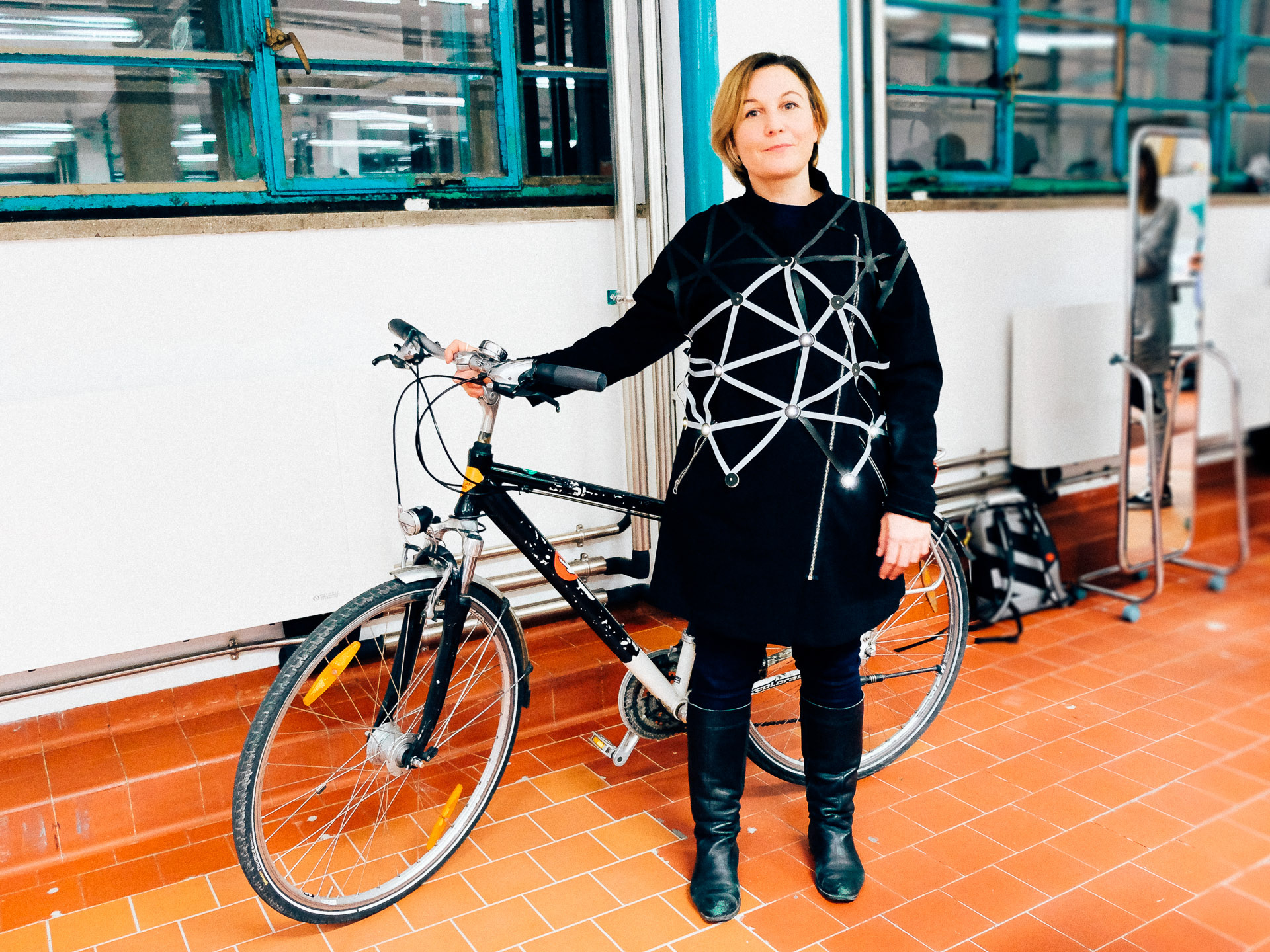This custom piece of wearable tech was meticulously handcrafted with weather resistant textiles and soft electronics during a pop-up E-Textile Tailor Shop, which invited commissions for custom "bike light jackets" from local bicyclists.